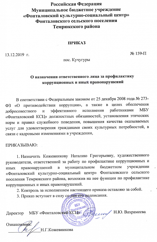 ПРИКАЗ от 13.12.2019 г. № 159-П О назначении ответственного лица за профилактику коррупционных и иных правонарушений