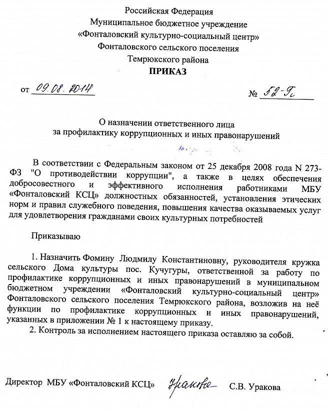 ПРИКАЗ от 09.08.2014 г. № 52-П О назначении ответственного лица за профилактику коррупционных и иных правонарушений