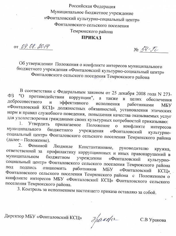 ПРИКАЗ от 09.08.2014 № 54-П Об утверждении Положения о конфликте интересов муниципального бюджетного учреждения «Фонталовский культурно-социальный центр» Фонталовского сельского поседения Темрюкского района